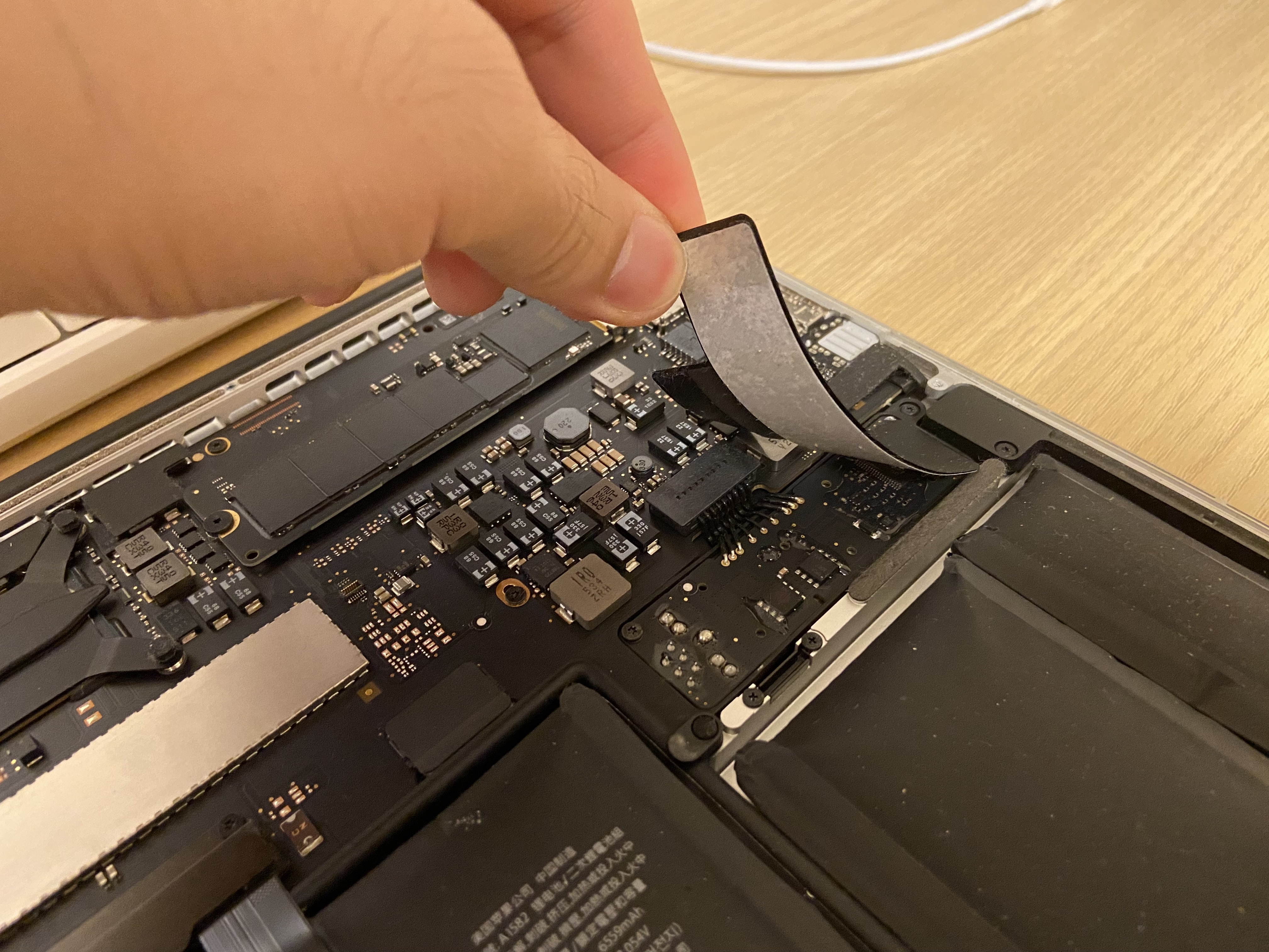 배터리를 떼어낸 자리를 어느 정도 깔끔하게 정리 한 다음에 새 배터리를 장착한다. 사진에서 처럼 파란색 필름을 떼어내면 스티커가 붙어있다. 스티커를 아래로 가게 해서 맥북에 접착시켜 준다.