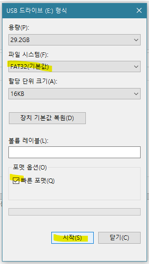 파일 시스템을 FAT32 형식으로 선택하고 시작 버튼을 클릭하여 포맷을 진행한다. 당연한 말이지만 포맷을 하면 USB의 모든 데이터가 지워진다.