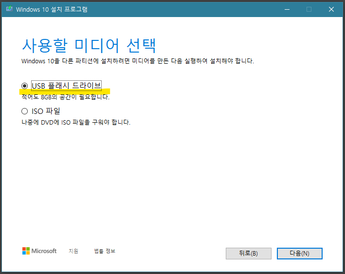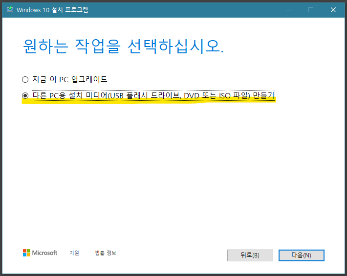 다운받은 프로그램을 실행한다. 원하는 작업을 선택하라는 화면이 뜨면 다른 PC용 설치 미디어(USB 플래시 드라이브...) 만들기를 선택하고 다음으로 넘어간다.