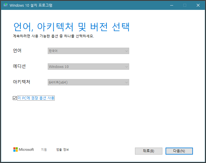 그 다음으로 언어, 아키텍처 및 버전을 선택하는 화면에 나오는데, 이건 필요에 따라 선택하면 된다. 나는 그냥 권장 옵션으로 선택했다.