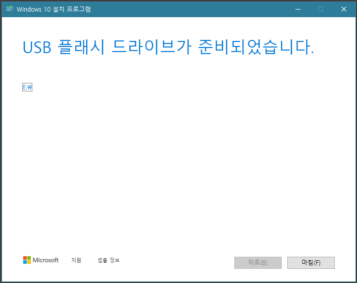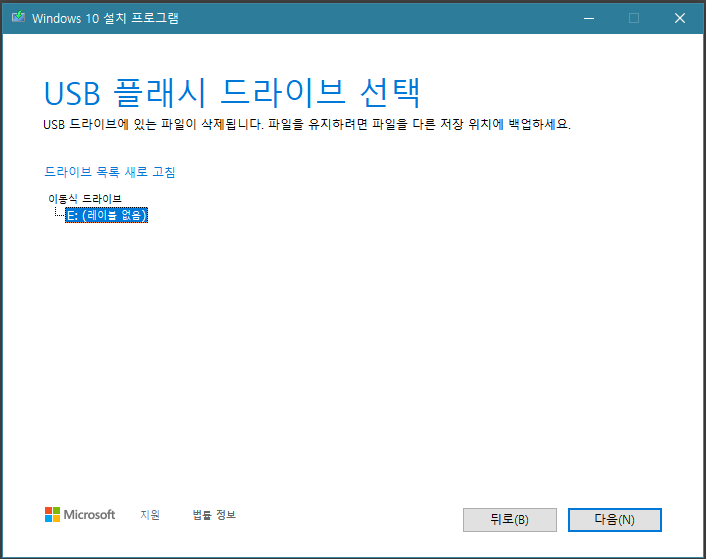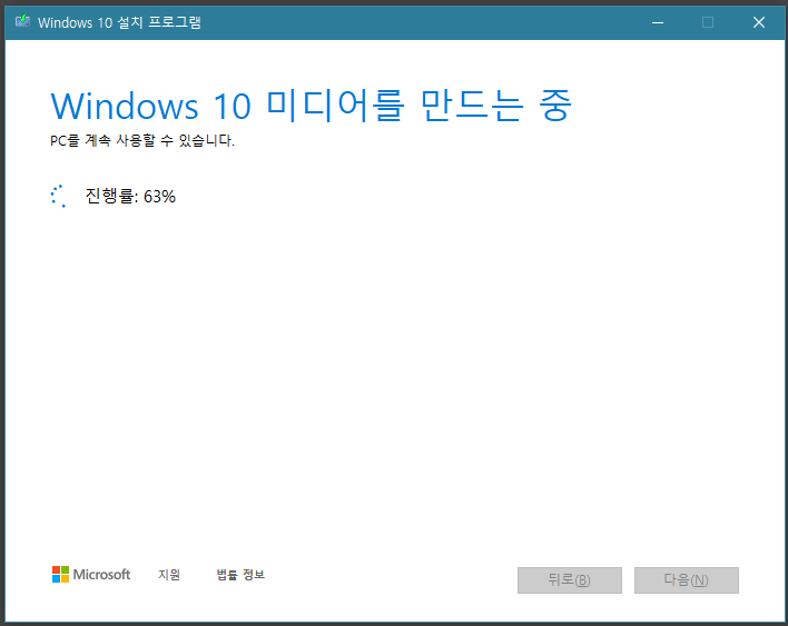 USB가 연결된 드라이브를 선택하고 다음 버튼을 클릭하면 USB로 윈도우10 다운로드 및 미디어 생성 과정이 진행된다.