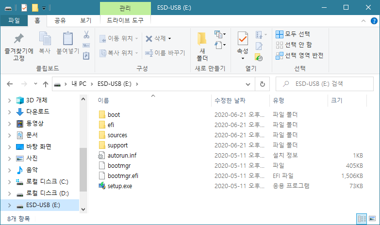 기다리면 USB 부팅 디스크 생성이 완료된다. USB 디스크에 아래와 같이 windows10 설치 관련 파일이 생성된 것을 확인할 수 있다.