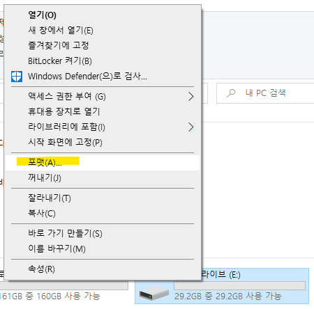 USB 드라이브 아이콘의 우클릭 메뉴에서 포맷을 클릭한다.